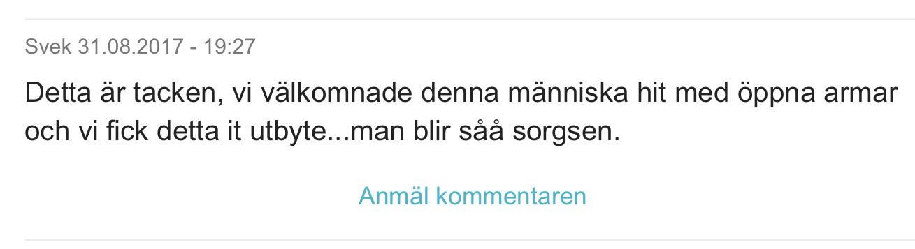 Han hade ju dessutom fått negativt asylbeslut. Men den som skrev kommentaren har väl ett sådant tankesätt att ”välkomnar vi en del asylsökande borde alla vara tacksamma för att de ens har en chans”.