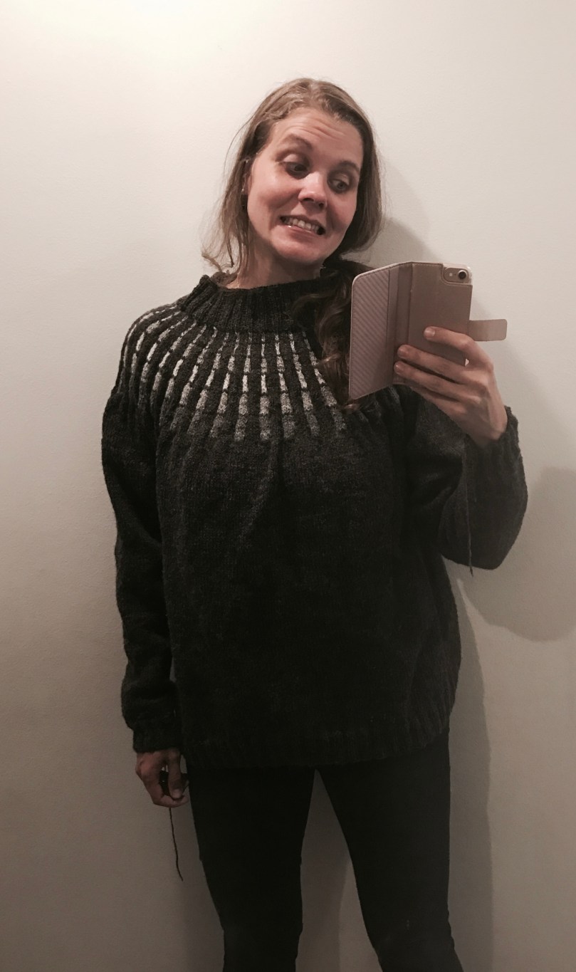 Det tog alltså nio dagar att sticka tröjan. Och sedan tog det ungefär lika länge att få in Arvid i tröjan när den var klar och skulle provas. Jag hade helt klart inte respekterat det här med att maska av löst i halsen. Arvids öron var röda en kvart efter att vi tryckt in honom i tröjan. Så då försökte jag sprätta upp halsen, men jag hade helt klart respekterat det här med att fästa trådarna. Om möjligt för mycket. Till sist klippte jag helt kallt upp halsen med sax och förvånansvärt bra gick det att rädda.