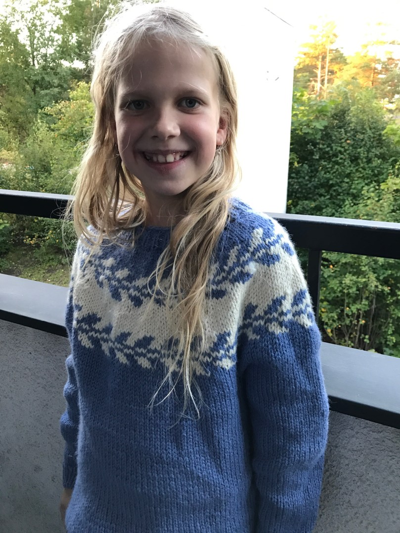 Nio dagar tog det att sticka den här tröjan till Arvid, i den lilablå nyans han själv valde.