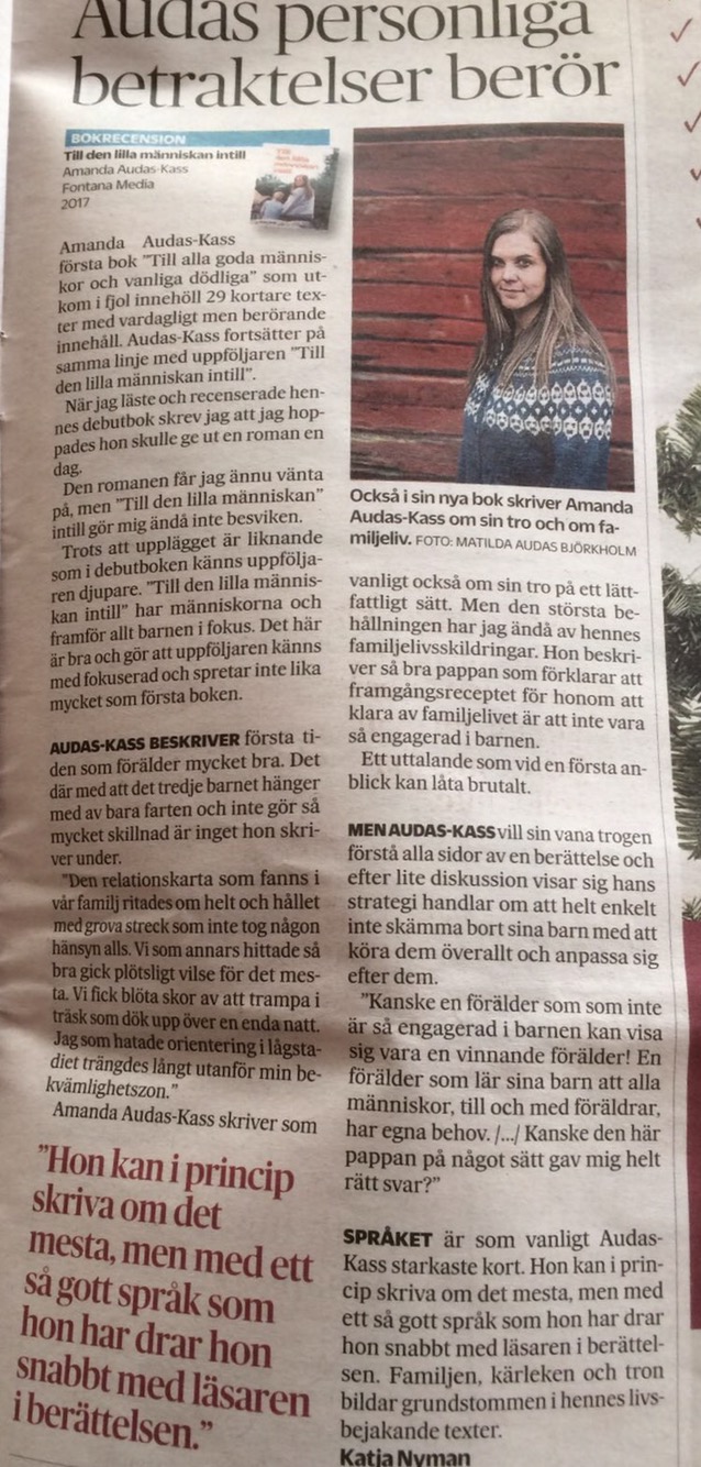 Uncategorized Lycka är december 2, 2017 amandaaudaskass6 kommentarer Lycka är att få en recension som värmer hjärtat. Och att ha en mamma som skickar bild på recensionen. I väntan på romanen som både jag och recensenten hoppas på får du gärna läsa Till den lilla människan intill. Dela detta: Dela på X (Öppnas i ett nytt fönster) X Dela på Facebook (Öppnas i ett nytt fönster) Facebook Gilla Laddar in …