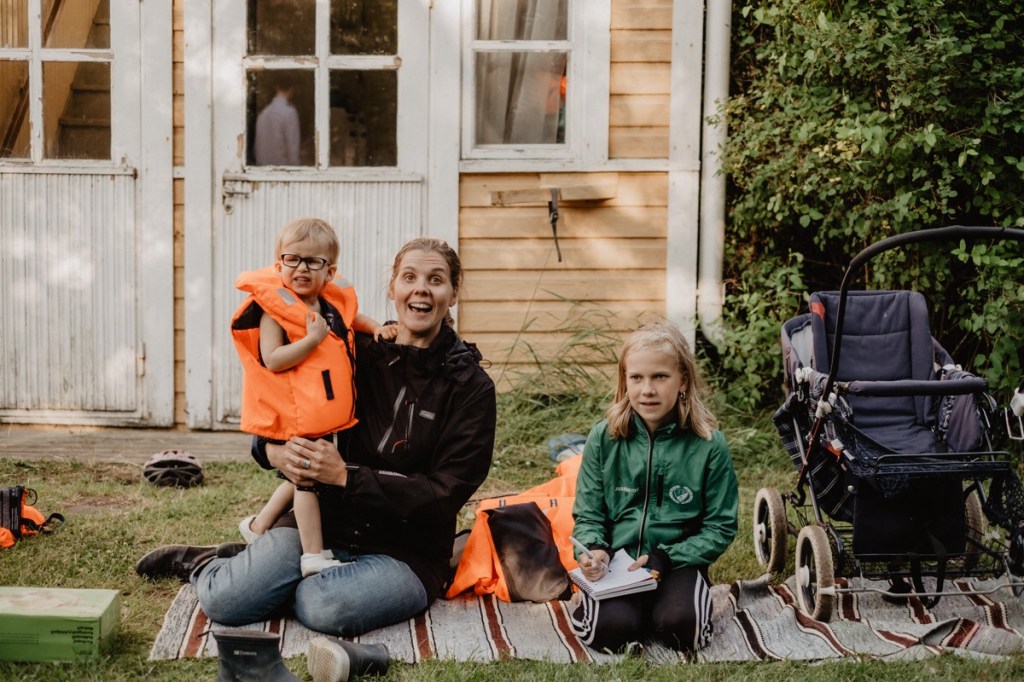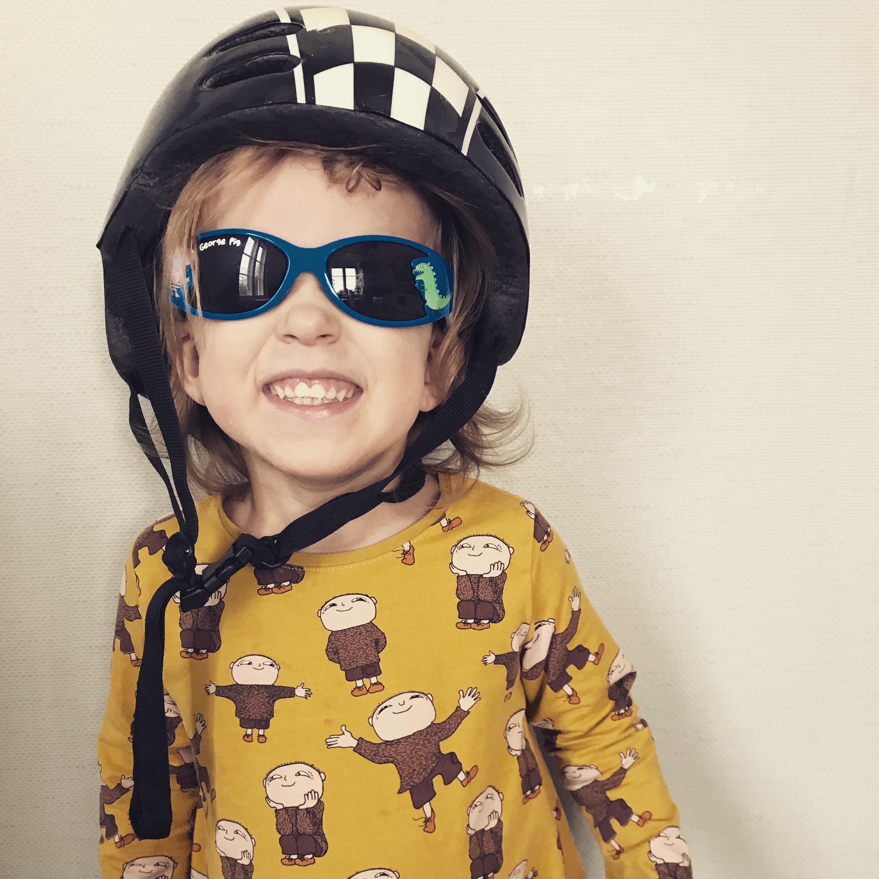 Men det finns också en vansinnigt rolig sak. Istället för att ropa när hon har ett ärende eller helt enkelt bara komma gående så kommer hon åkande på sin lilla mopo. Ni vet, en sådan där i plast som vartannat finländskt barn äger. Hon sparkar med båda benen och kommer med väldig fart genom hallen. Oftast har hon av någon anledning också på sig en mössa och ett par neongula hörselskydd ovanpå den. Och när hon sedan ska framföra sitt ärende (hunger, törst, tristess, existentiell fråga, ont i magen, kli på benet…) så stannar hon, tar av sig hörselskydden och meddelar med lite officiell stämma sitt ärende.