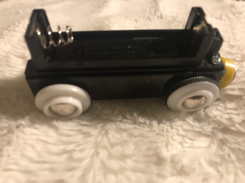 Fasen: när Hilde borstar sina tänder ska Fredrik stå bredvid och spela på det här loket. Närmare bestämt ska han spela på den fjäder som batteriets minuspol vilar emot.